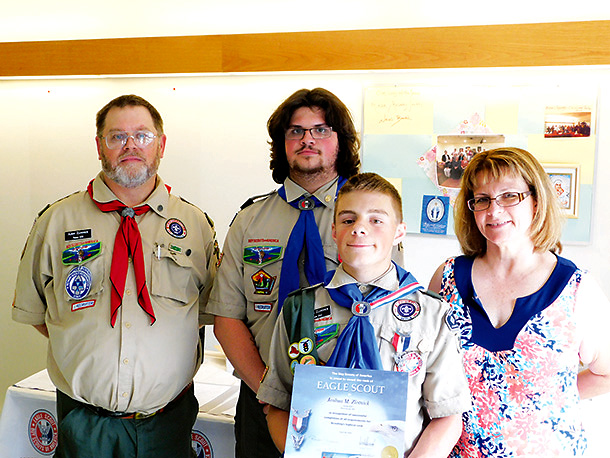Joshua Zlotnick became the most recent member of Boy Scout Troop 222 of Grafton to obtain scouting’s highest rank, that of Eagle Scout, in a ceremony held Saturday, August 25 at Grafton’s Lady of the Snow Catholic Church. The son of Scoutmaster Andy Zlotnick and his wife Joan, Joshua becomes the second member of the family to obtain the rank of Eagle Scout.