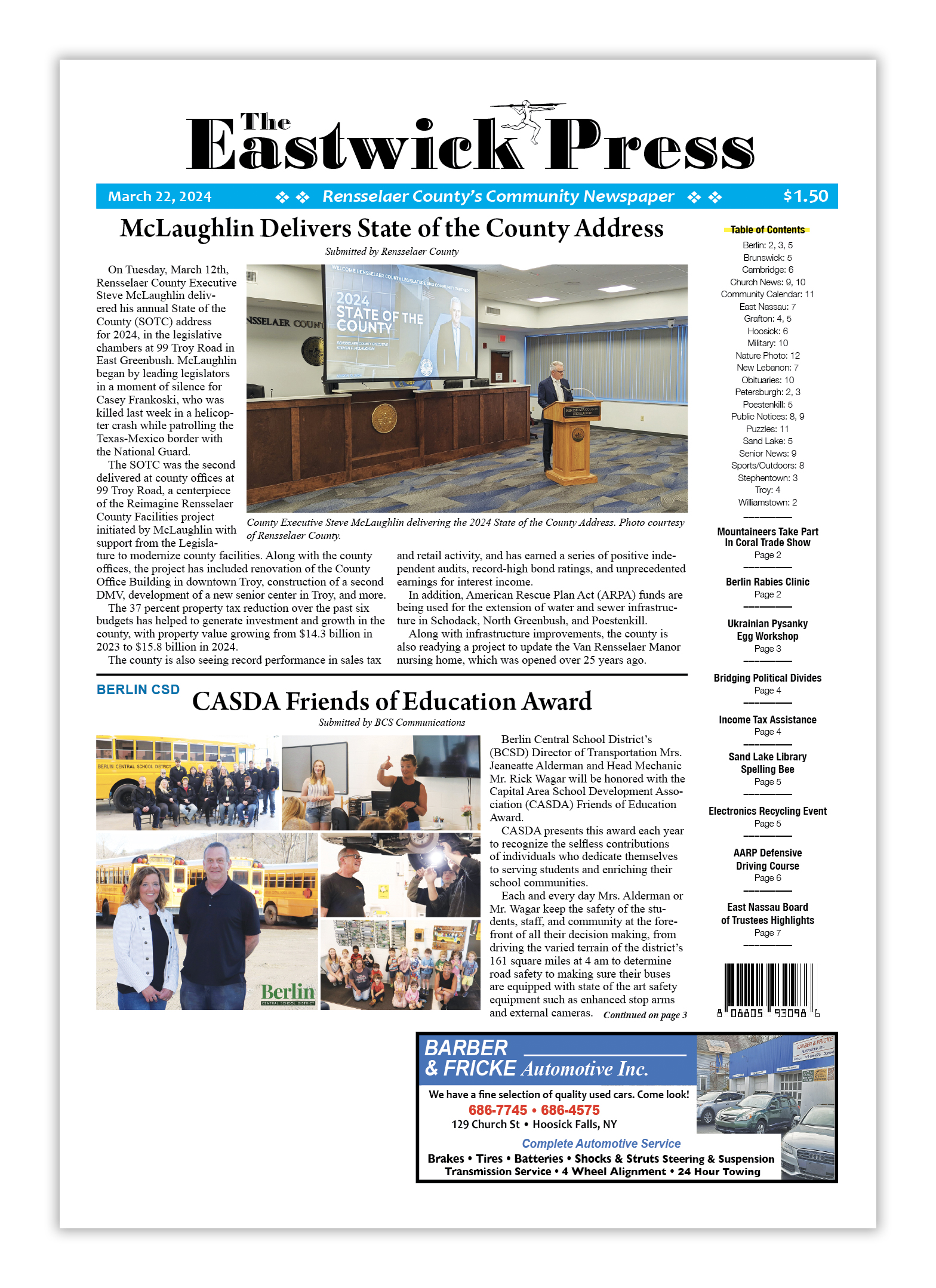 by Denise Wright The Stephentown Board’s St. Patrick’s Day meeting began with a moment of silence to honor former town board member Gerry Robinson. Robinson focused on “improving local service opportunities, protecting Stephentown’s unique rural environment, and increasing local jobs and amenities by encouraging economic development appropriate to the size, atmosphere, and well-being of our […]